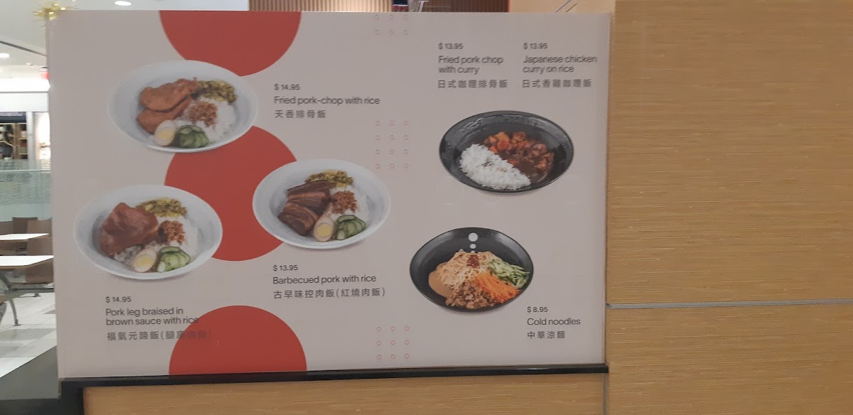Main Dishes: The menu offers rice and noodle plates such as Braised Pork Belly On Rice, Braised Beef On Dry Noodles, and a range of signature bento boxes. Options like Curry Chicken Nuggets On Rice and Deep Fried Pork Chop On Rice are also available, providing a selection of protein-focused meals that are suitable for lunch or dinner.